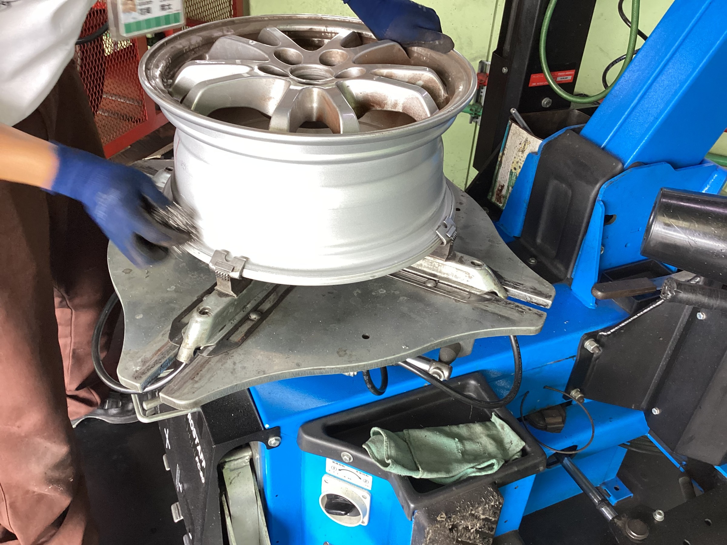 古いタイヤを取り外し、ホイールのリムに付着している