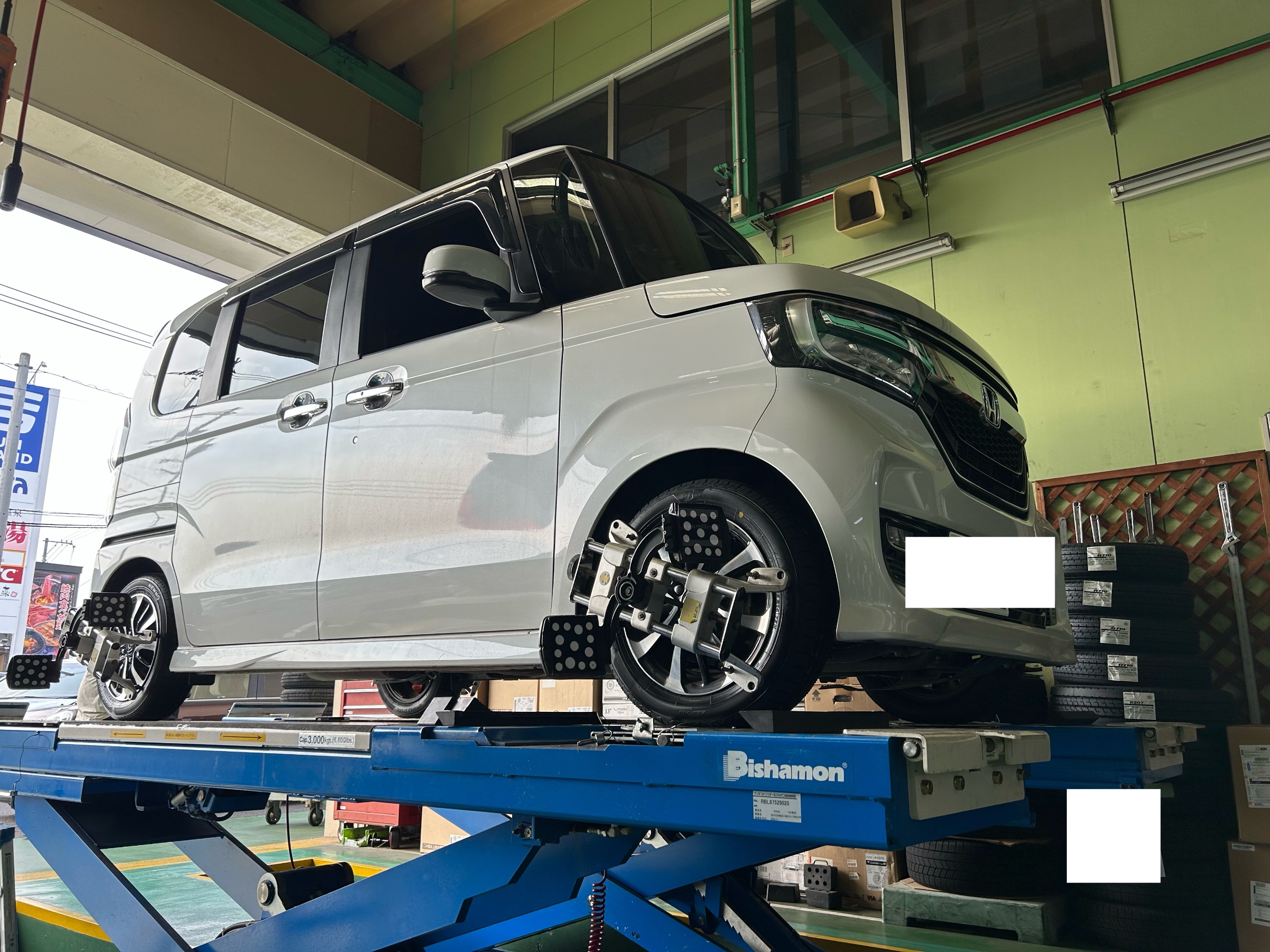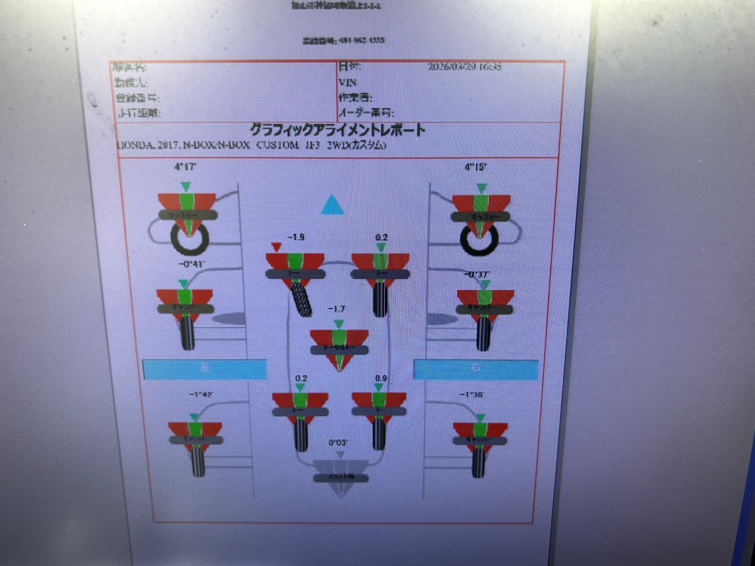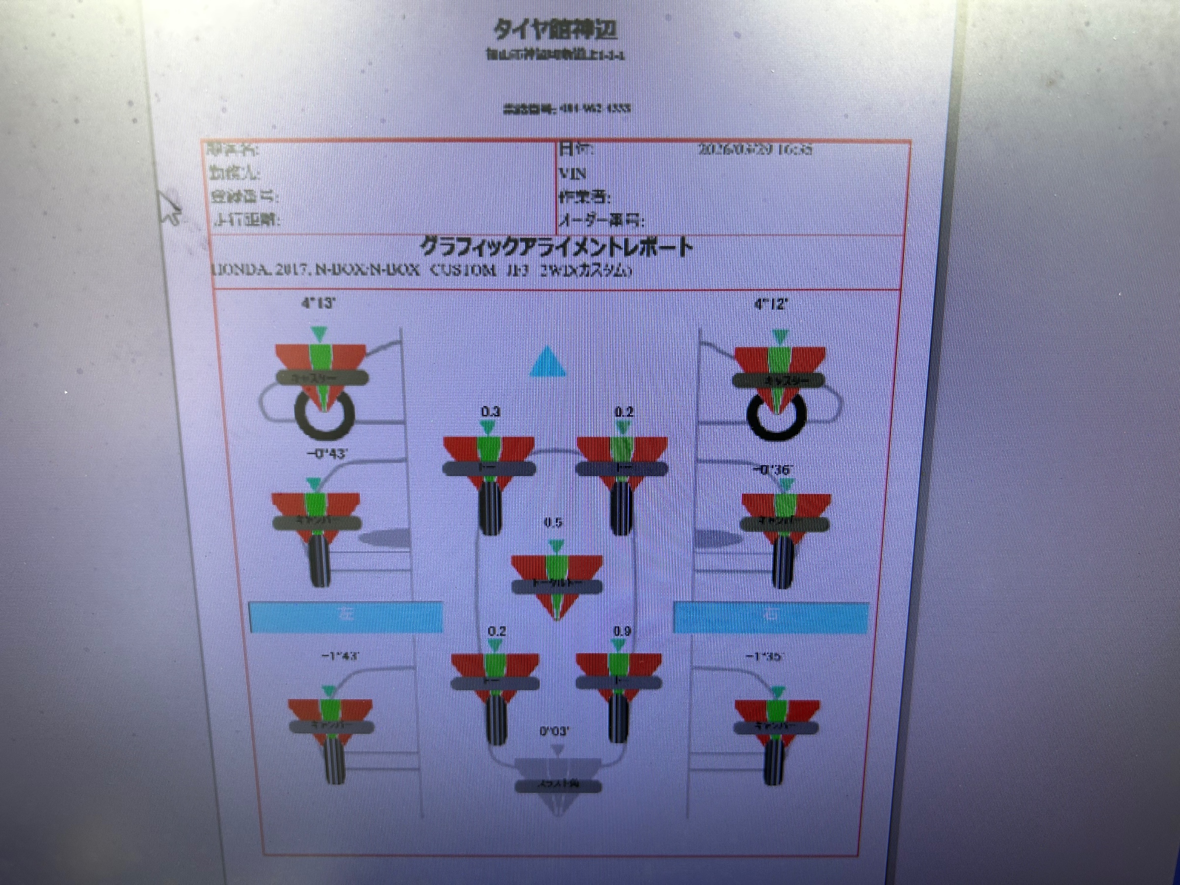 走行安定性の向上とタイヤの偏摩耗防止のために測定・調整を行いました。