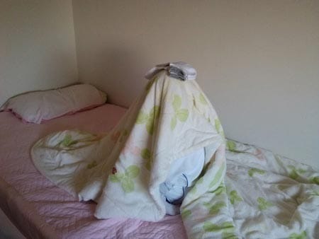 ばれたらお姉ちゃんに怒られるから布団に隠れてるらしく(^_^;)