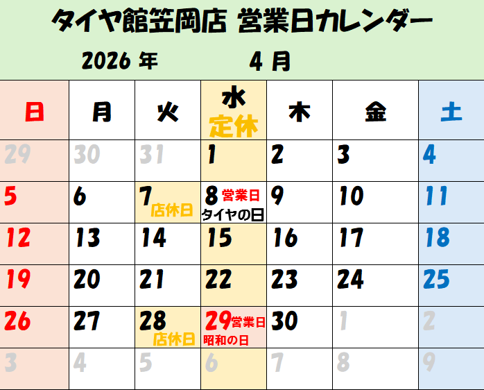明日、4月28日(火)は店休日となります。29日(水)は祝日の為、営業日となります!!皆様のご来店をスタッフ一同お待ちしております。 ポスト 2026年4月27日 いつもタイヤ館笠岡店をご利用いただきありがとうございます。 明日28日(火)は店休日となります。 また、29日(水)は祝日のため、営業日となっております。 ご来店お待ちしております! タイヤ館 笠岡 住所:714-0086岡山県笠岡市五番町3-5 電話番号: 0865-60-0365 相談予約 カテゴリ:お知らせ 担当:三宅