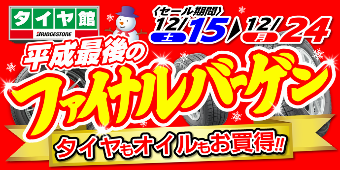 ファイナルバーゲン開催! ポスト 2018年12月12日 タイヤ館笠岡店では、今年最後の大売出しを開催! 12/15日(土)~12/24(月)までファイナルバーゲンを開催致します。 夏タイヤ、冬タイヤ 在庫タイヤの大放出! この機会に是非ご利用ください。 ご来店お待ちしています。 カテゴリ:お知らせ