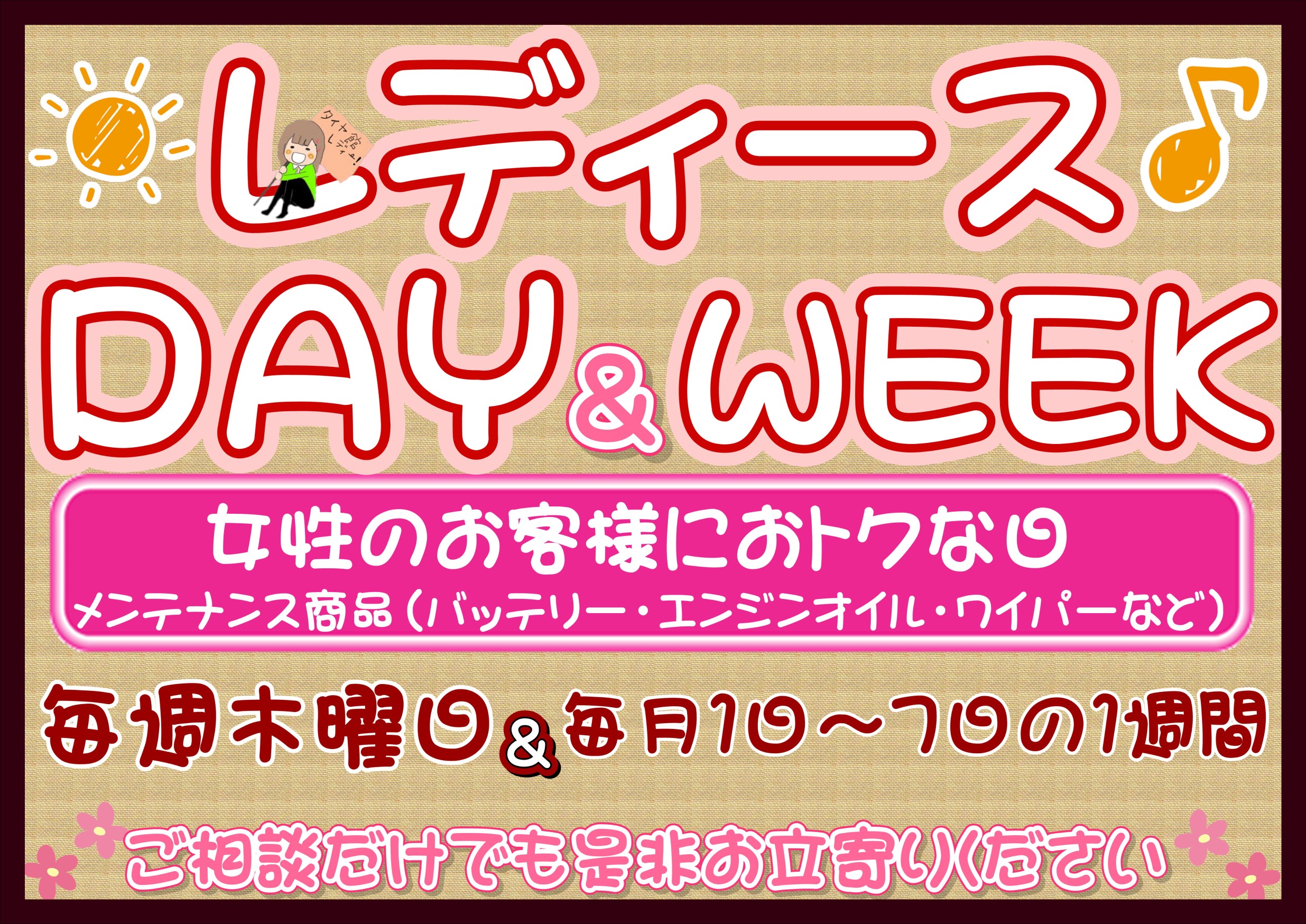 ❤︎毎週木曜日は・・・❤︎ ポスト 2019年1月24日 こんにちは ✧*。タイヤ館 笠岡店です✧*。 本日は、、、、 木曜日❤︎女性にお得なレディースDAY❤︎ ☆メンテナンス商品☆ ・バッテリー ・オイル ・ワイパー ・エアコンフィルター などなど 粗品もプレゼントしております。 是非、この機会にどうぞ!!(*´▽`*)