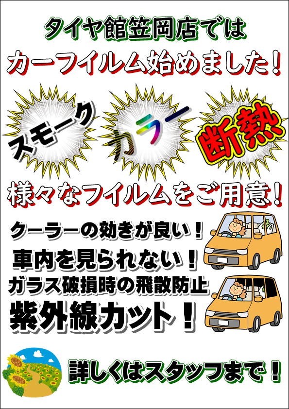 全国一億人の沖ブロファンの皆様こんにちは|ω・) タイヤ館笠岡店の太郎こと沖ですよw さてさて・・・ 今回タイヤ館笠岡店では カーフィルムの施工を始めました( *´艸`) この暑いのにフイルムは必需品と言っても過言ではないと思います(ΦωΦ) 更に!!!!! ガラス交換やガラスの修理もしてしまい...