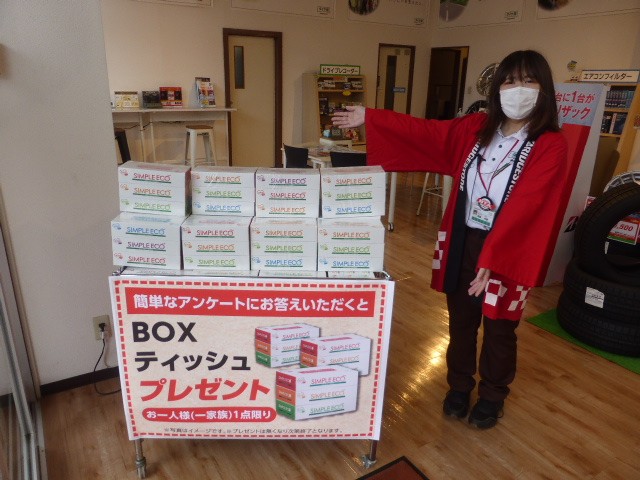 今回はアンケートご記入いただくとティッシュのプレゼントや…