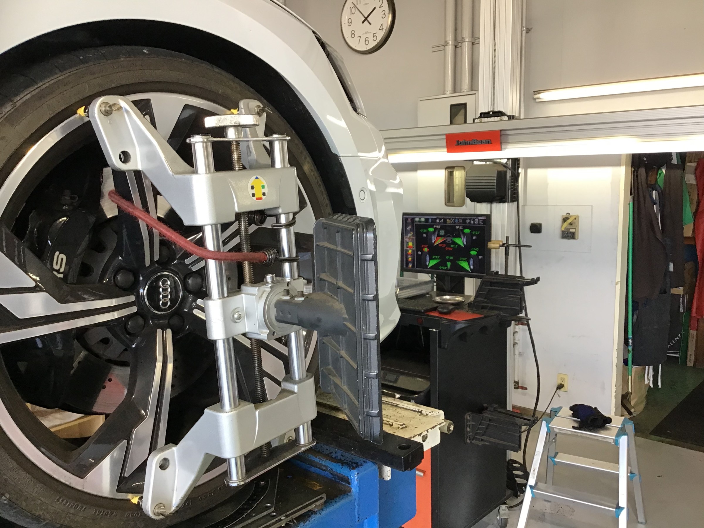アライメント調整なんです!写真の様にセンサーをタイヤに付けてズレを数値化してメーカー基準値に合わせ