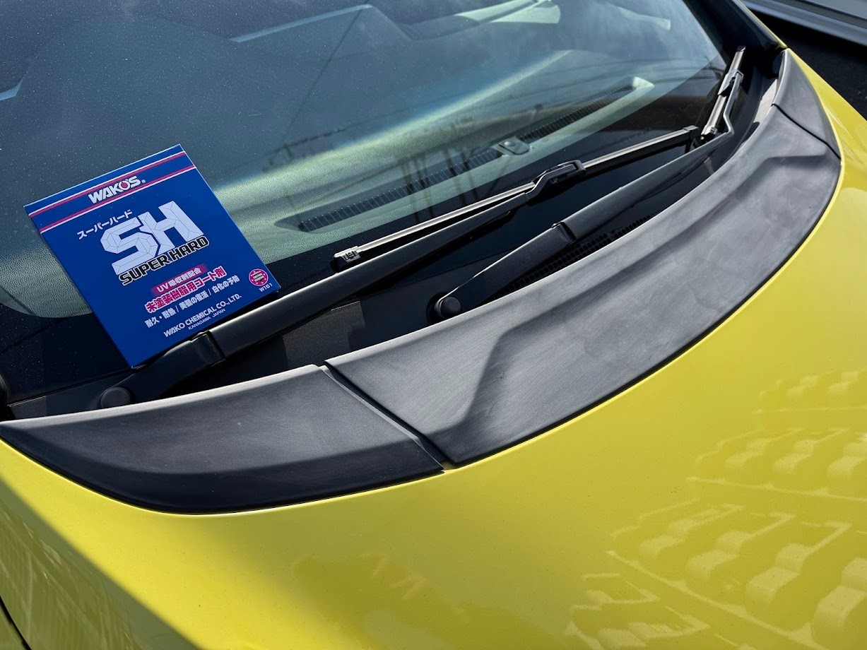 三代目フィットのボンネットのこの部分の樹脂パーツ、日も当たりやすいのでほぼ100%白くなってしまいます。