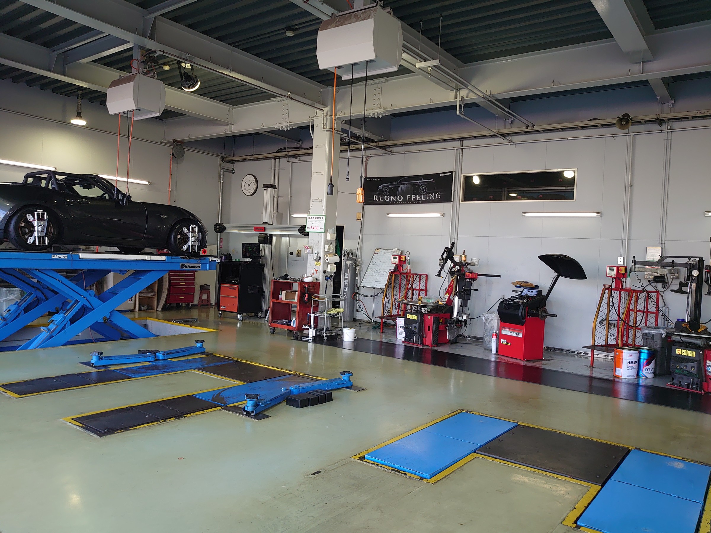 タイヤチェンジャーやリフトなどはこまめにメンテナンスしているので、お客様の大事な車の作業も快適に行えています。