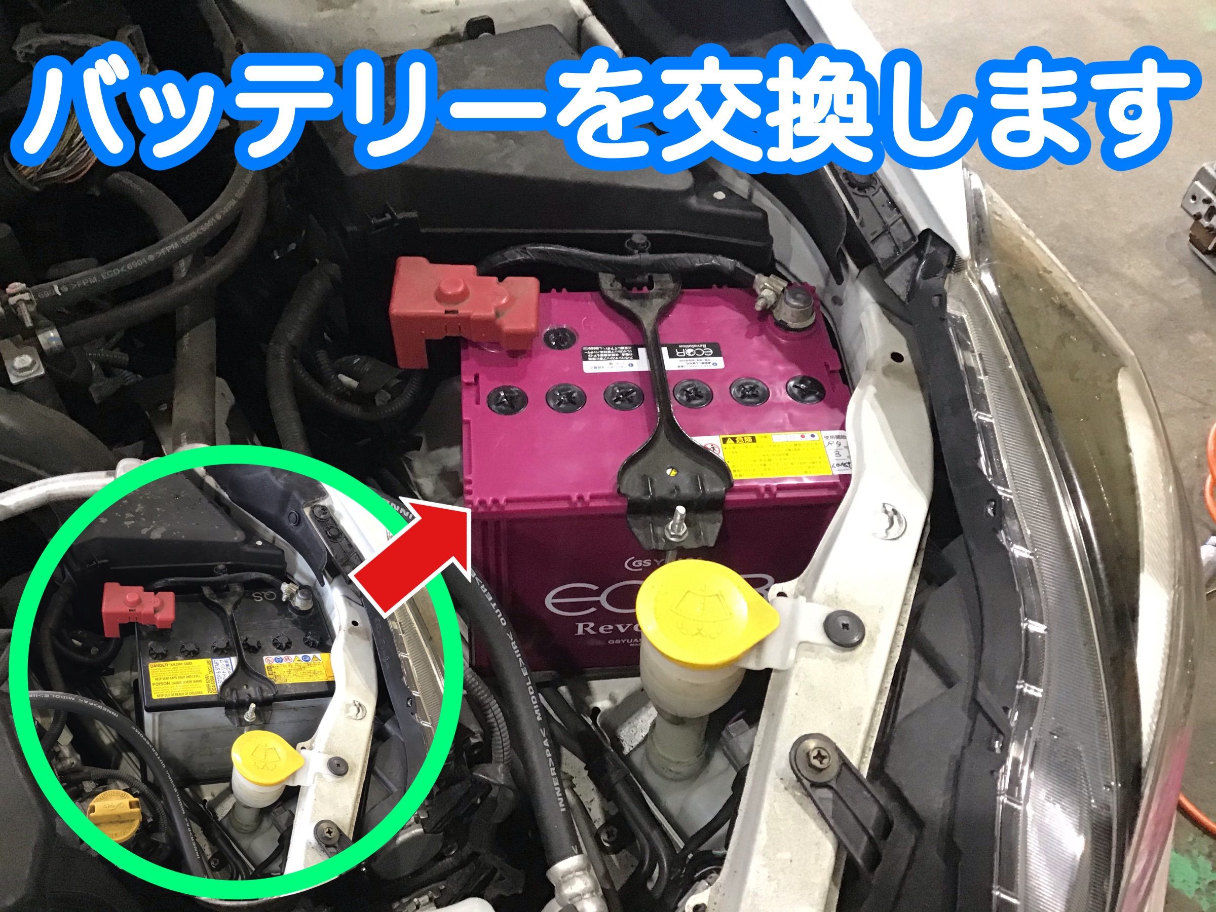 純正のバッテリーから赤紫色のエコRレボリューションに交換です!