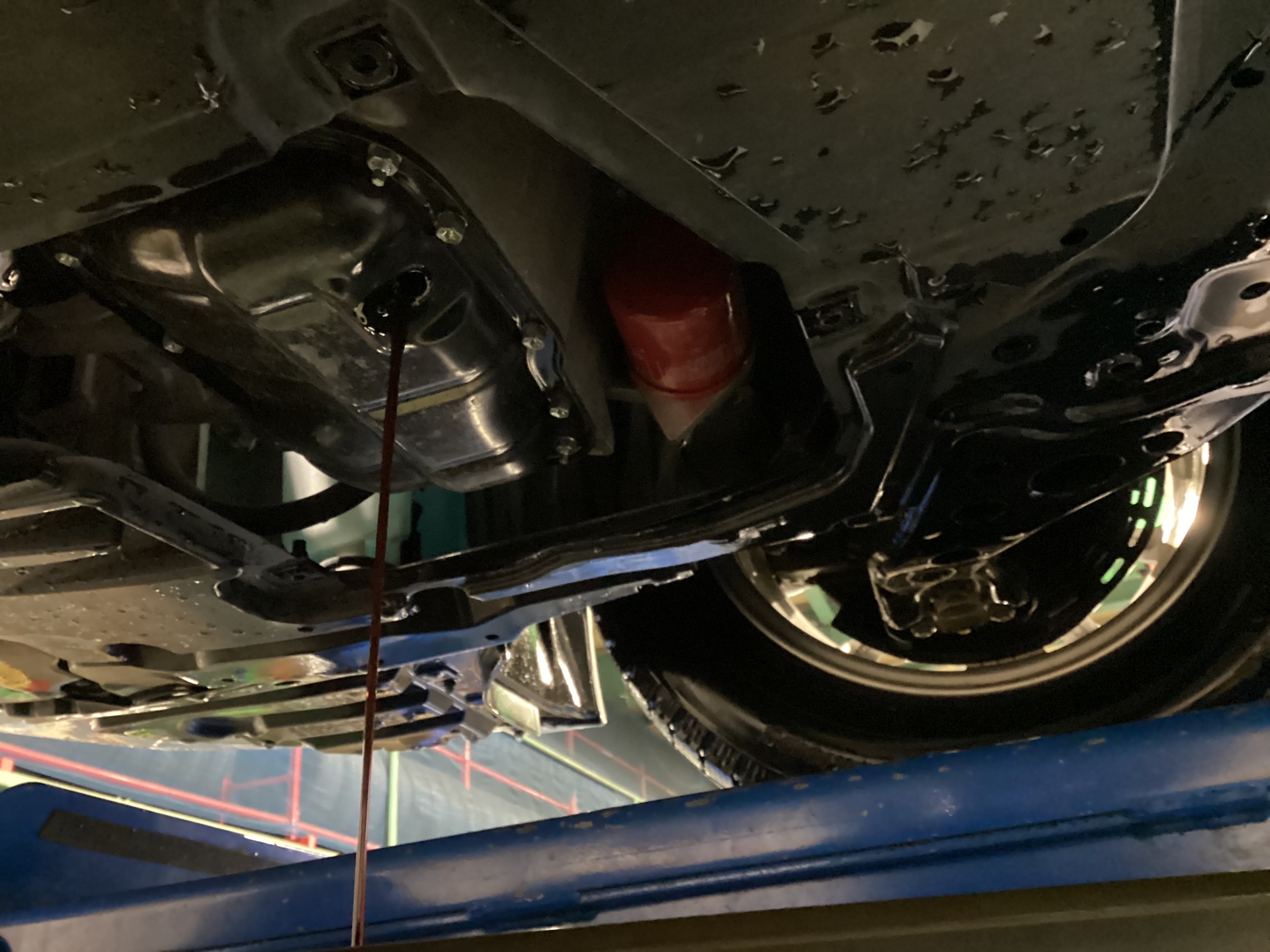 お車をリフトアップしたら、エンジン下のオイルパンにあるドレンボルトから