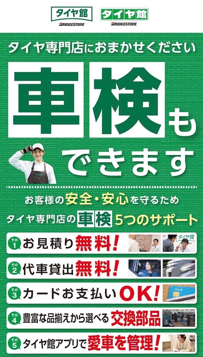 タイヤだけじゃない!タイヤ館で車検出来ます!法定費用もスマホ決済OK!