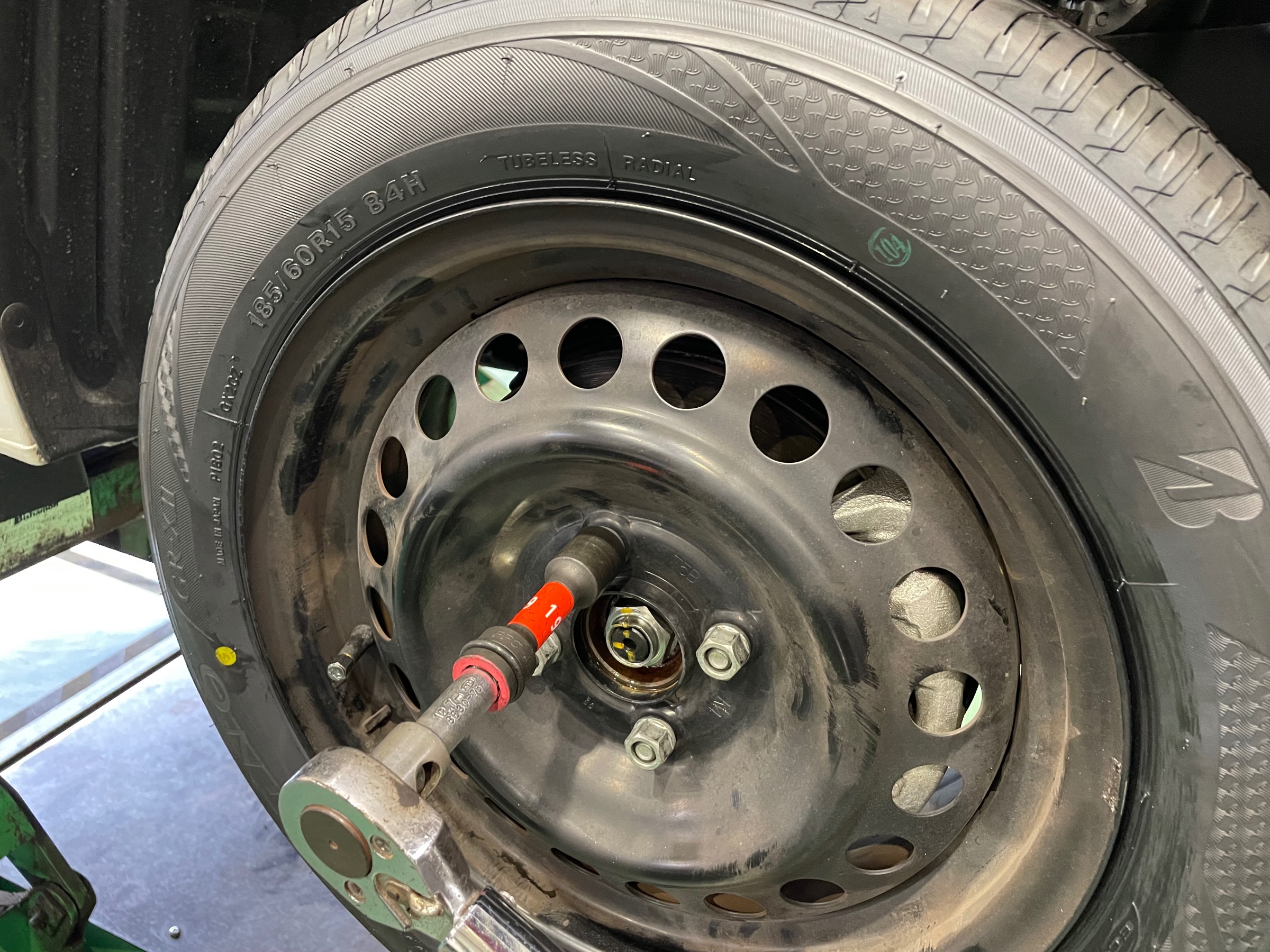 サクサクっとタイヤを新品に組み換え、バランス調整をし、お車にタイヤホイールをお取り付けです!