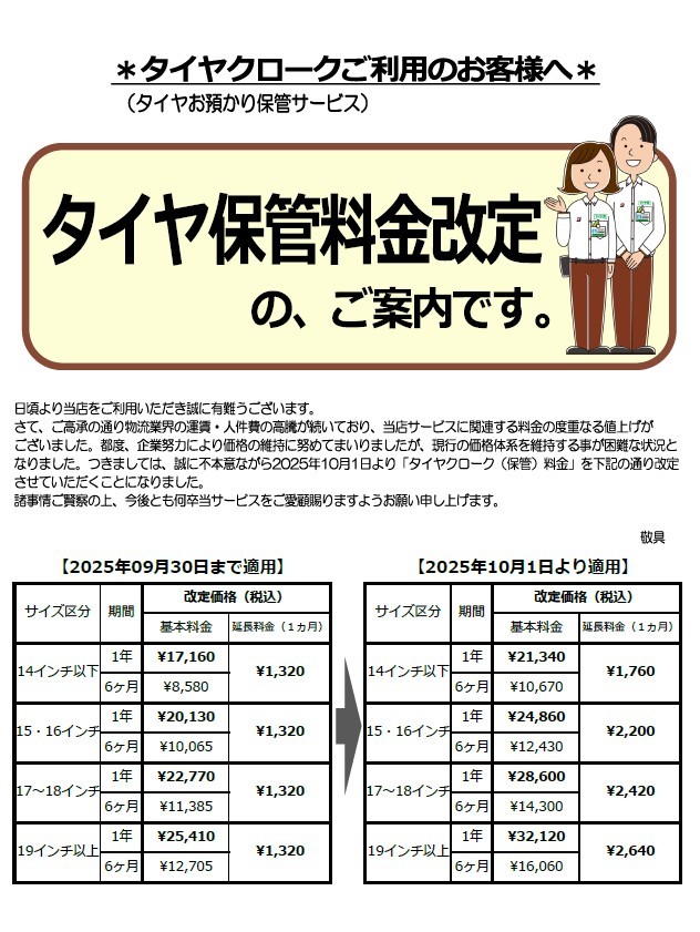 タイヤクローク 料金改定のご案内 ポスト 2025年10月7日 2025年10月1日より お客さまには大変ご迷惑をお掛けすることと なりますが、何卒ご理解いただくとともに、 今後ともご愛顧を賜りますようお願い申し上げます カテゴリ:お知らせ