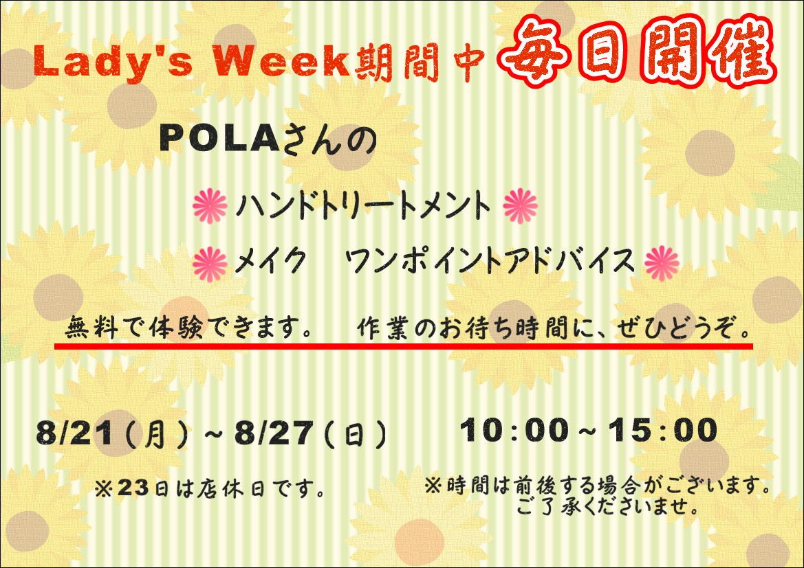 8/21(月)から8/27(日)までレディースウィークです!!!!!!