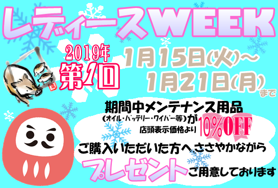 ★レディースWEEK★ ポスト 2019年1月6日 今月の15日から21日は、 女性の方に嬉しい一週間となっております♪(´艸`*) 期間中、オイルやバッテリー、ワイパーなどの メンテナンス用品が10%OFFです! また、ご購入いただいた方へ、 ささやかではございますが プレゼントをご用意しております(*´з`)/ エアチェックやお車の安全点検も 無料で行なっておりますので、 お気軽にご来店くださいませ★ 担当:谷口