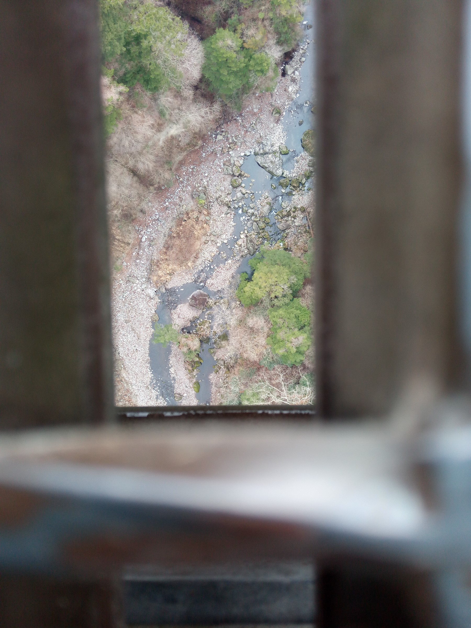 ちょうど橋の真ん中(一番高い所)に到着! 金網から下を覗き