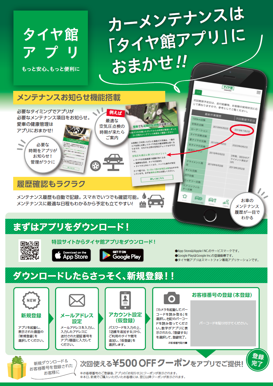 タイヤ館のHPもアプリから見ることもできるようになりますよ(●´ω`●)