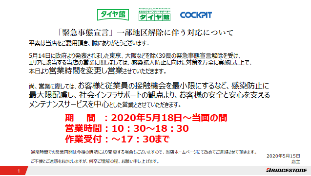 定休日のご案内 ポスト 2020年5月26日 皆さんこんにちは(*´∀`*)/ タイヤ館春日のHPをご覧いただき、誠にありがとうございます(●´ω`●) 明日5/27は定休日となっております! また、緊急事態宣言解除にともない、営業時間の変更をお伝えいたします! 10:30~18:30までの営業で、作業受付は17:30までとなっております! ご来店の際はご注意くださいませ(。-_-。)