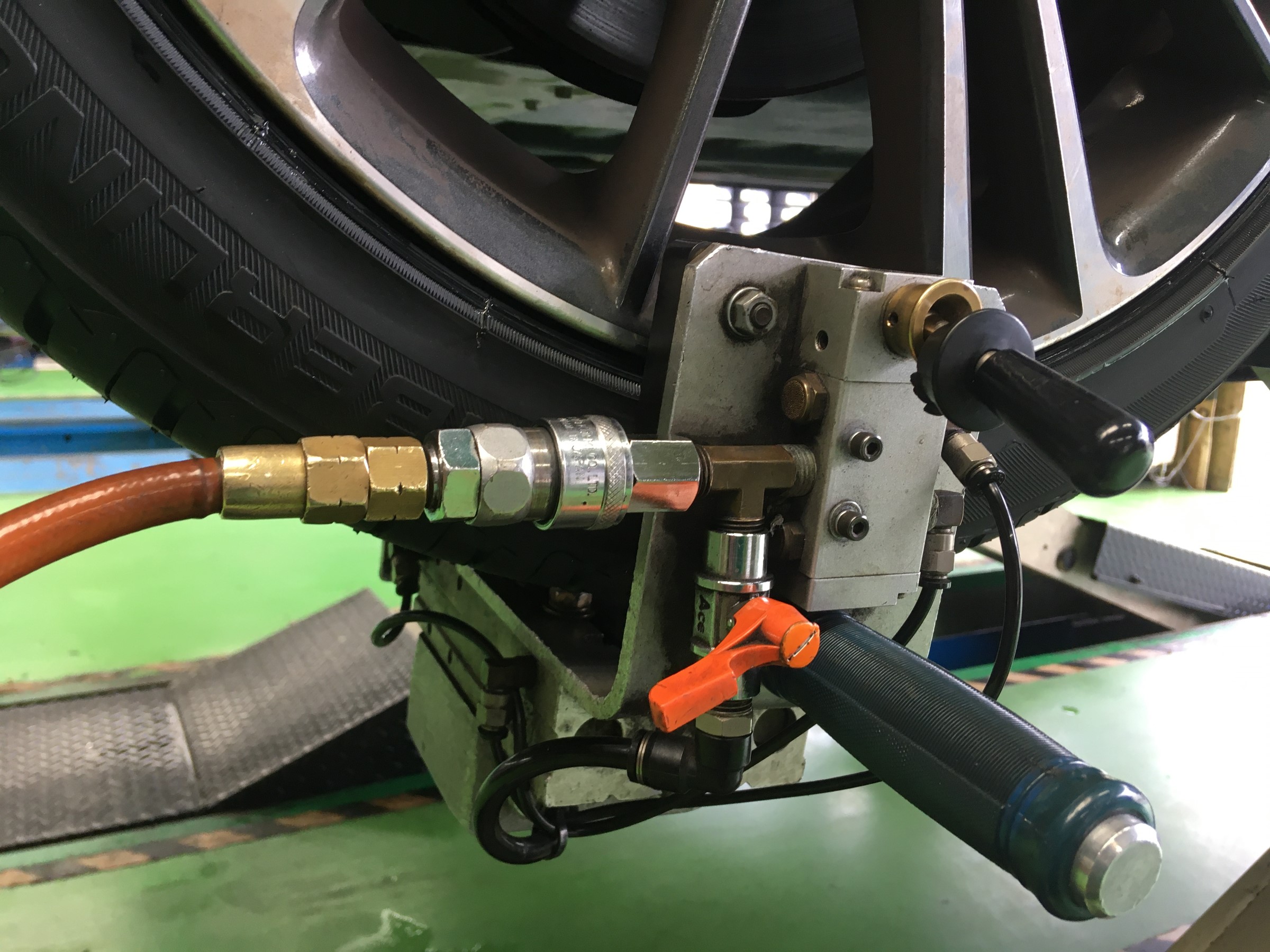 タイヤをお車に取り付けの時にタイヤに専用の機械を装着し取り付けを行います。