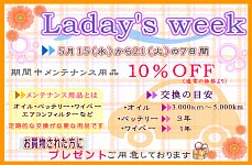 いつもタイヤ館 春日のHPをご覧いただき 誠にありがとうございます。 5月は女性のお客様に嬉しい レディースWEEKとなっております(´艸`*)♪ 今月は15日は定休日となっておりますので 16日~21日の6日間となっております★ 期間中は、オイル、バッテリー、ワイパーなどの メンテナンス用品が10%OFF...