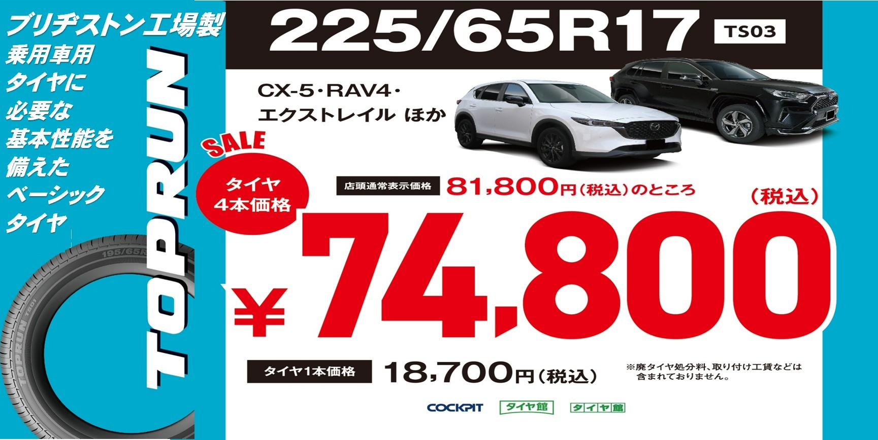 春日市・福岡市で225/65R17のタイヤをお探しのお客様へ タイヤ館では 人気サイズ「225/65R17」の お買い得タイヤ【トップラン】の在庫有ります(^^♪ SUVやミニバン(ハリアー・RAV4・エクストレイルなど)に多く採用されているこのサイズは需要が高まっています。その中で、今回は新商品「トップラン...