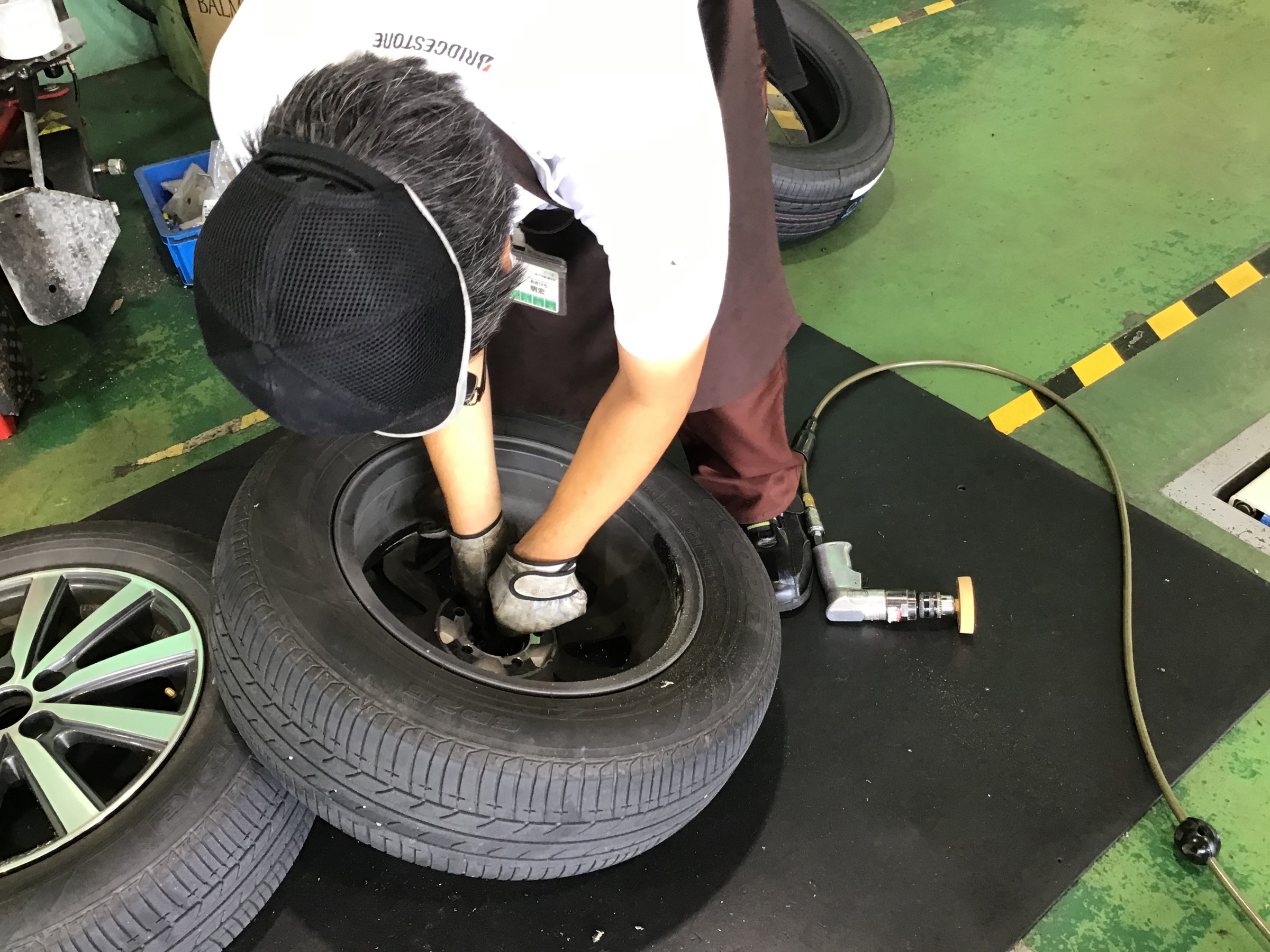 その後、新品のタイヤへ組み付けていき、ホイールバランスをとっていきます。
