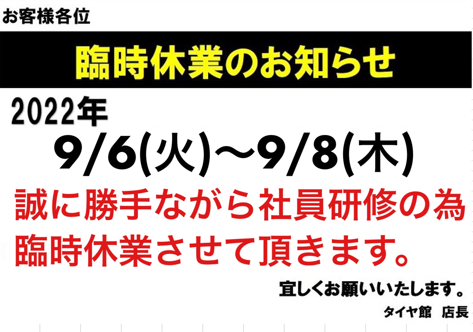 誠に勝手ながら社員研修の為9/6(火)〜9/8(木)まで臨時休業とさせて頂きます。