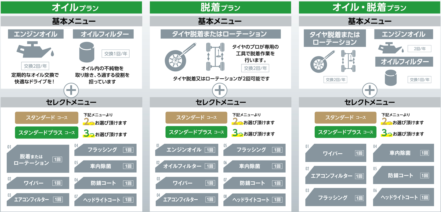 「オイルプラン」や「脱着プラン」など