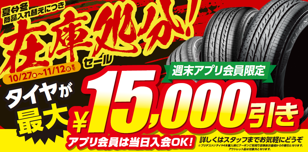 アプリご加入でタイヤク-ポン割引がもれなく適応します。(一部商品・アウトレットは除く)