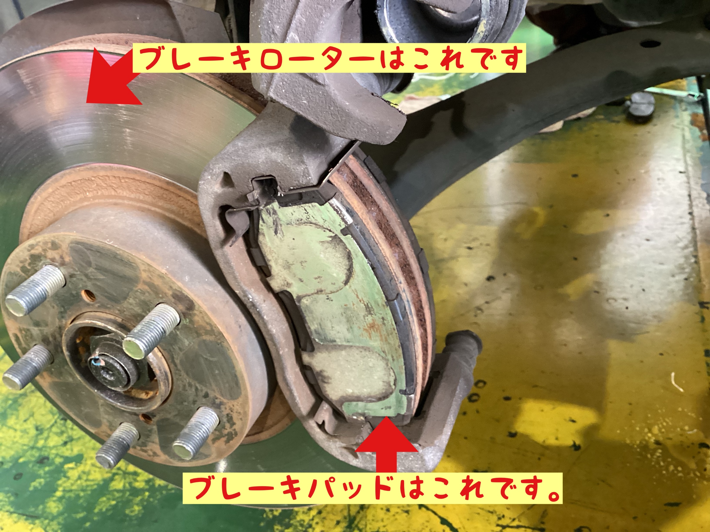ブレーキパッドは、タイヤと一緒に回転しているブレーキローターという部品を挟み込み