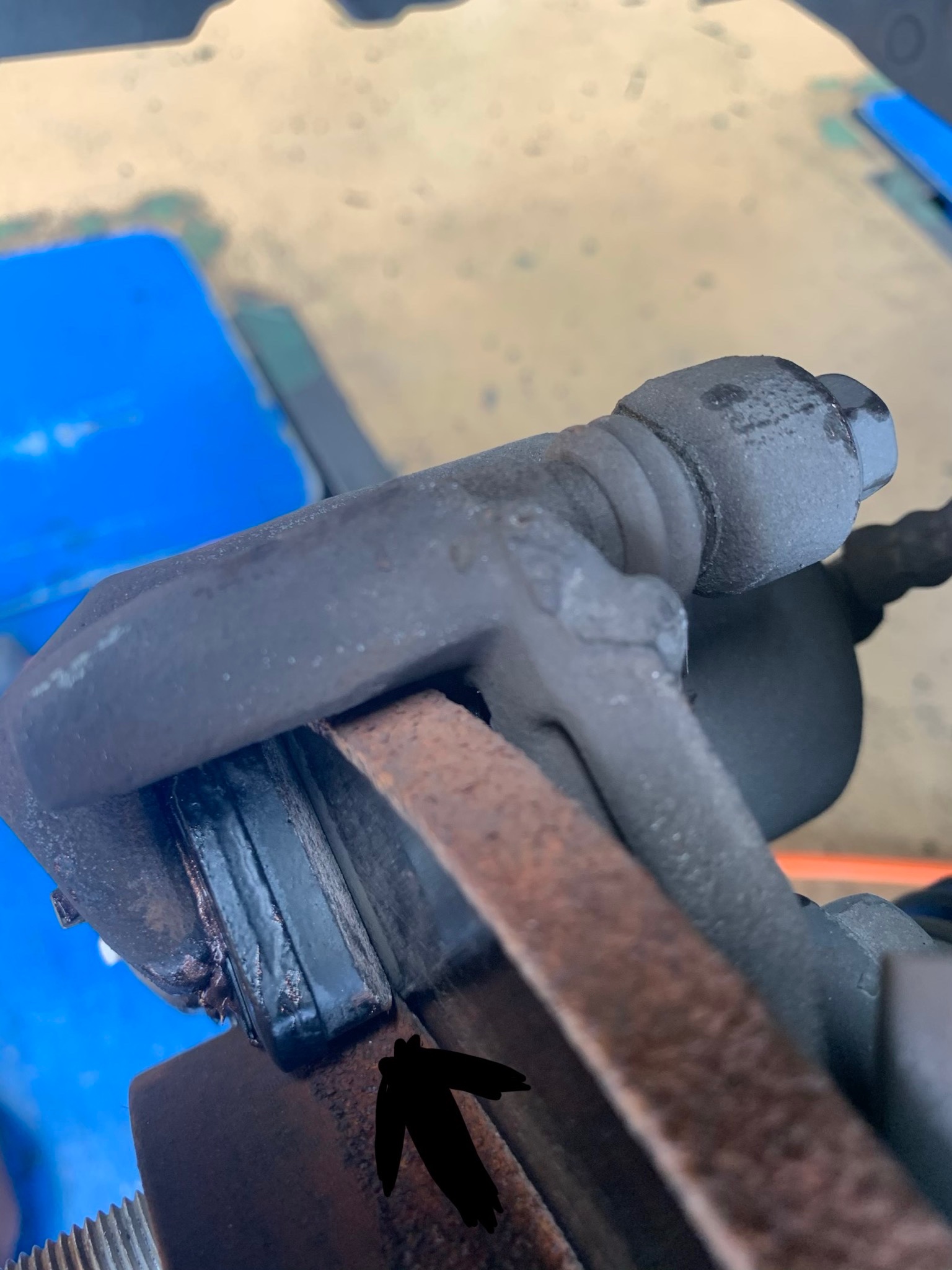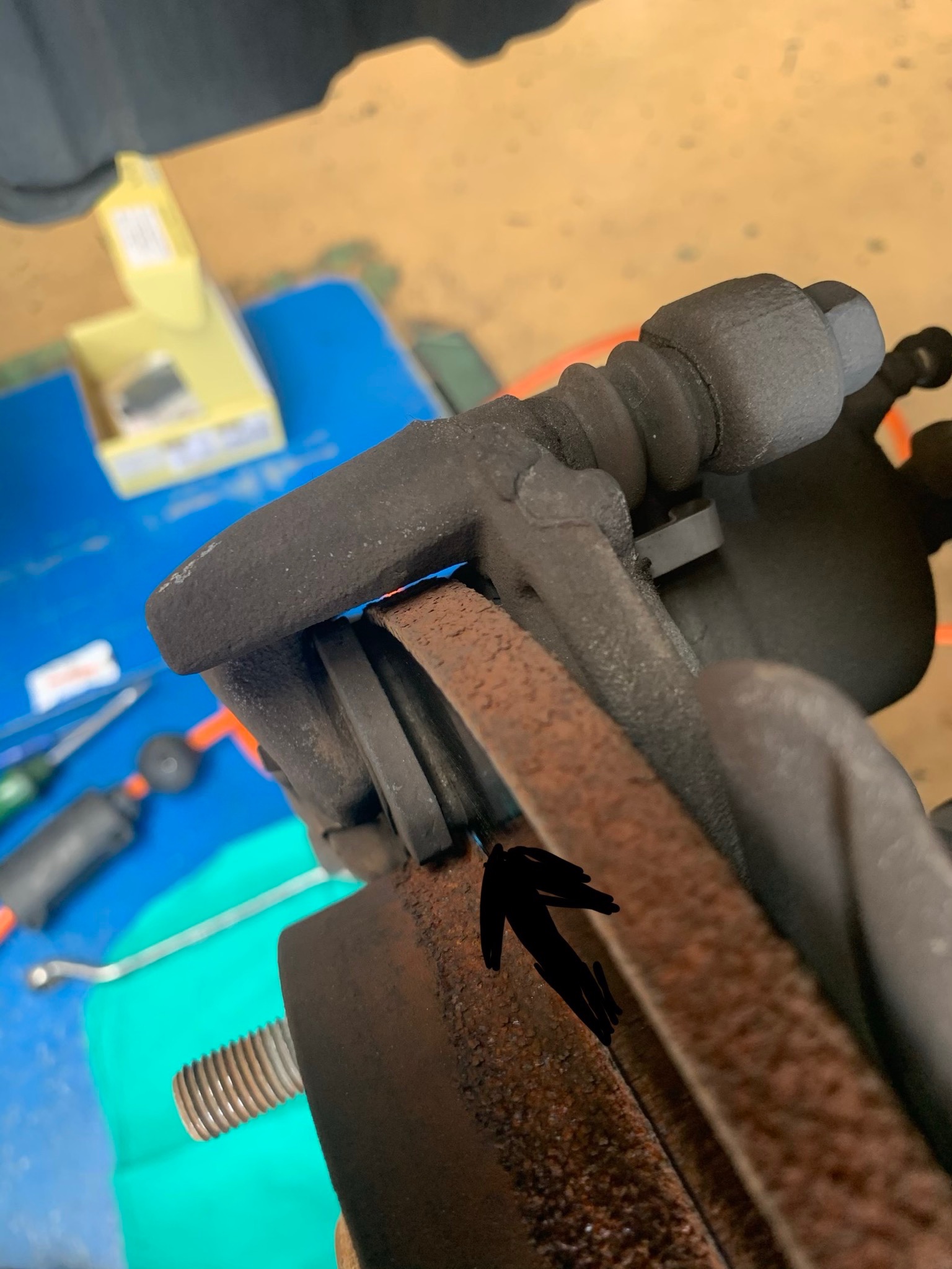 こちらが交換前の画像です。矢印の部分がブレーキパッドです。