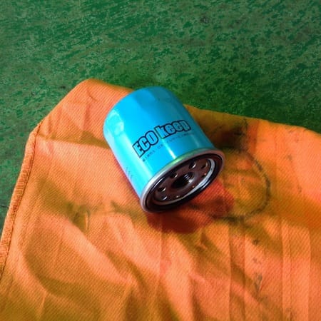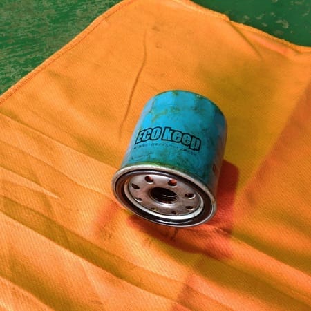 オイル交換での、オイルの抜ける場所(オイルドレン)、エレメント交換時の新品エレメント。