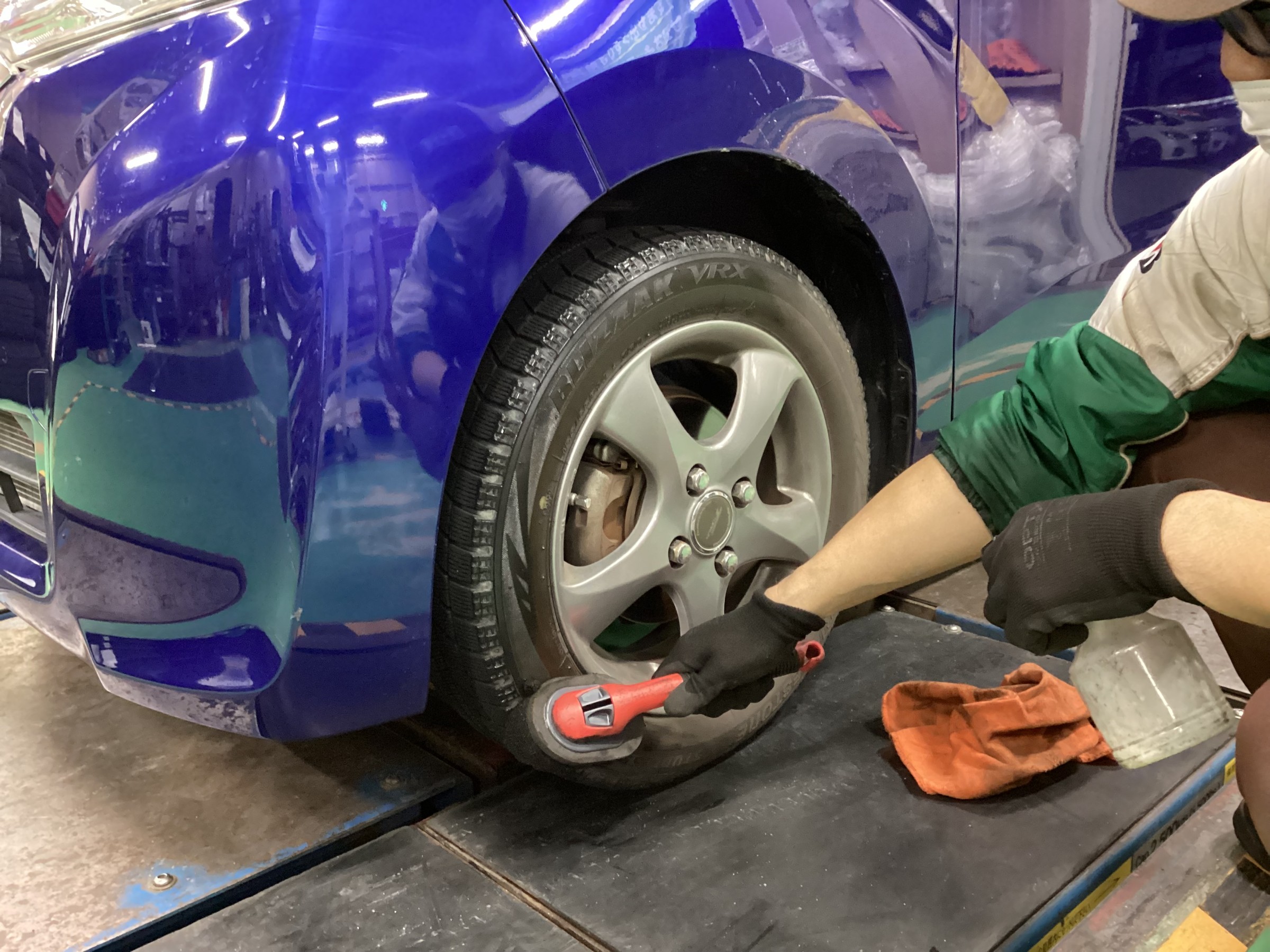 タイヤの残り溝を専用工具やタブレットを使用して点検します。