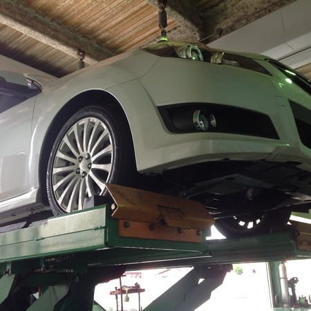 オイルは車の下から抜く車種が多く、今回もそうでしたので持ち上げて抜きます。