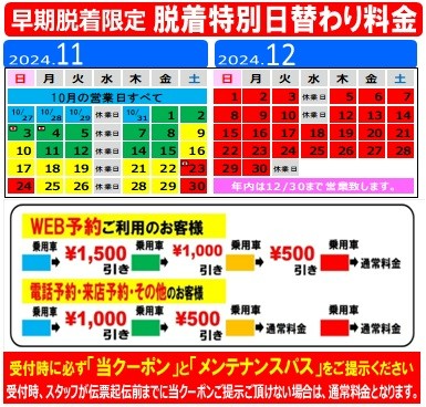 ①10月限定1500円OFF ②11月前半限定1000円OFF ③11月後半限定500円OFF