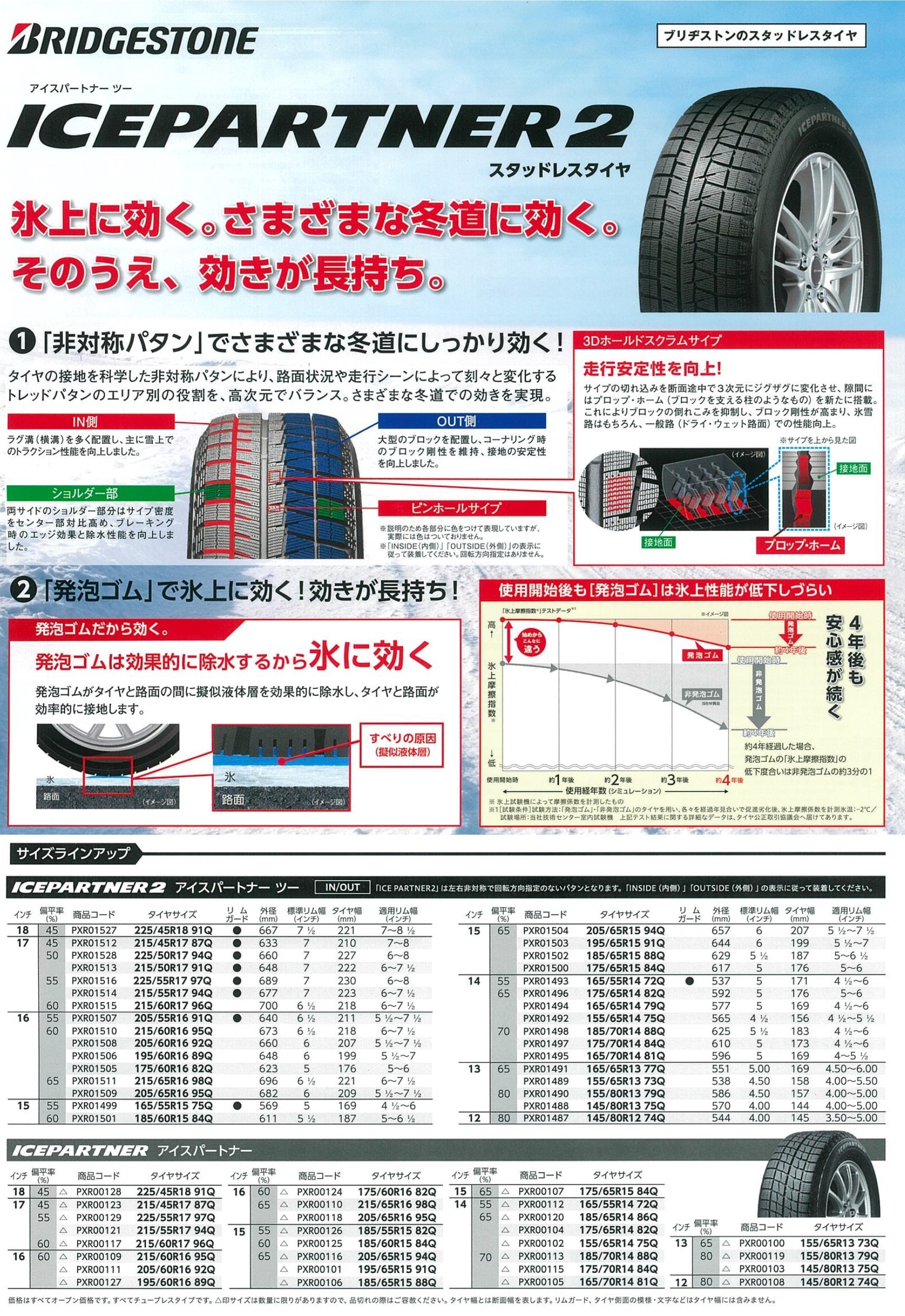 ICEPARTNER2は氷上の水を吸い上げ、高い氷上性能を実現するピンホールサイプも搭載していますが、「発泡ゴム」の採用も優れた氷上性能を実現している大きな理由です。「発泡ゴム」は、ゴム内の気泡と太い水路で、すべりの原因となる氷の上の「水膜」を取り除くブリヂストンの独自技術です。路面の「水膜」を素早く効率的に除水することで、タイヤが氷路面にしっかりと密着し滑りにくくしました。また、発泡ゴムは使用開始後も氷上性能が低下しづらいのも特長です。