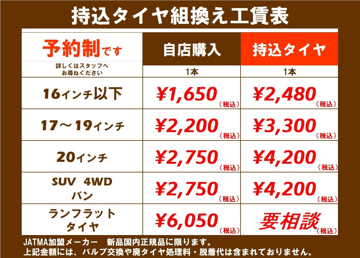 脱着料金(1台4400円~)やバルブ交換(1個440円~)・廃タイヤ処理料(1本440円~)