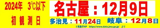 昨年の3℃以下初観測は12月9日(名古屋) 11月24日(多治見)