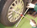 □当店では、クロスレンチを使用し、ホイールに傷をつけないように丁寧に対角線上に均等に仮締めした後、専用工具(トルクレンチ)を使用して規定のトルク「推奨締め付けトルク:乗用車90~120N・m(9~12kg・m)、軽自動車50~70N・m(5~7kg・m)で締め付けます。