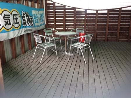 デッキは自動ドアの向かって左側です。冬は少し寒いですが夏は屋根に覆われており