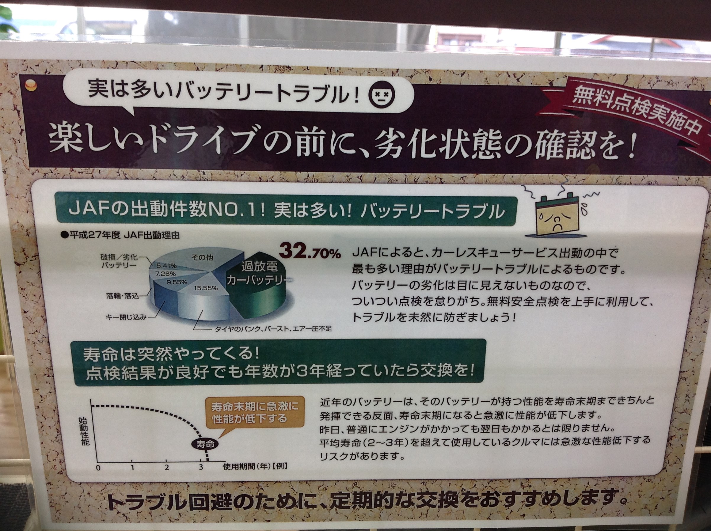 遠出をされる方などはバッテリ-が上がってしまうとせっかくのお出かけ先で時間や余分な出費がかかりいい思い出が台無しになってしまうかも・・・