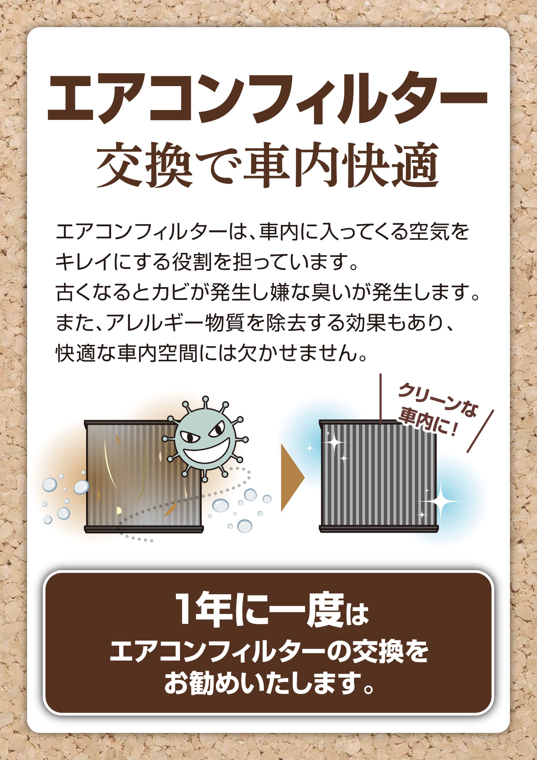 これからエアコンを使用する機会が増えてくると思いますが家庭用のエアコンと同じでお車にもエアコンフィルタ-がついているお車がほとんどです。