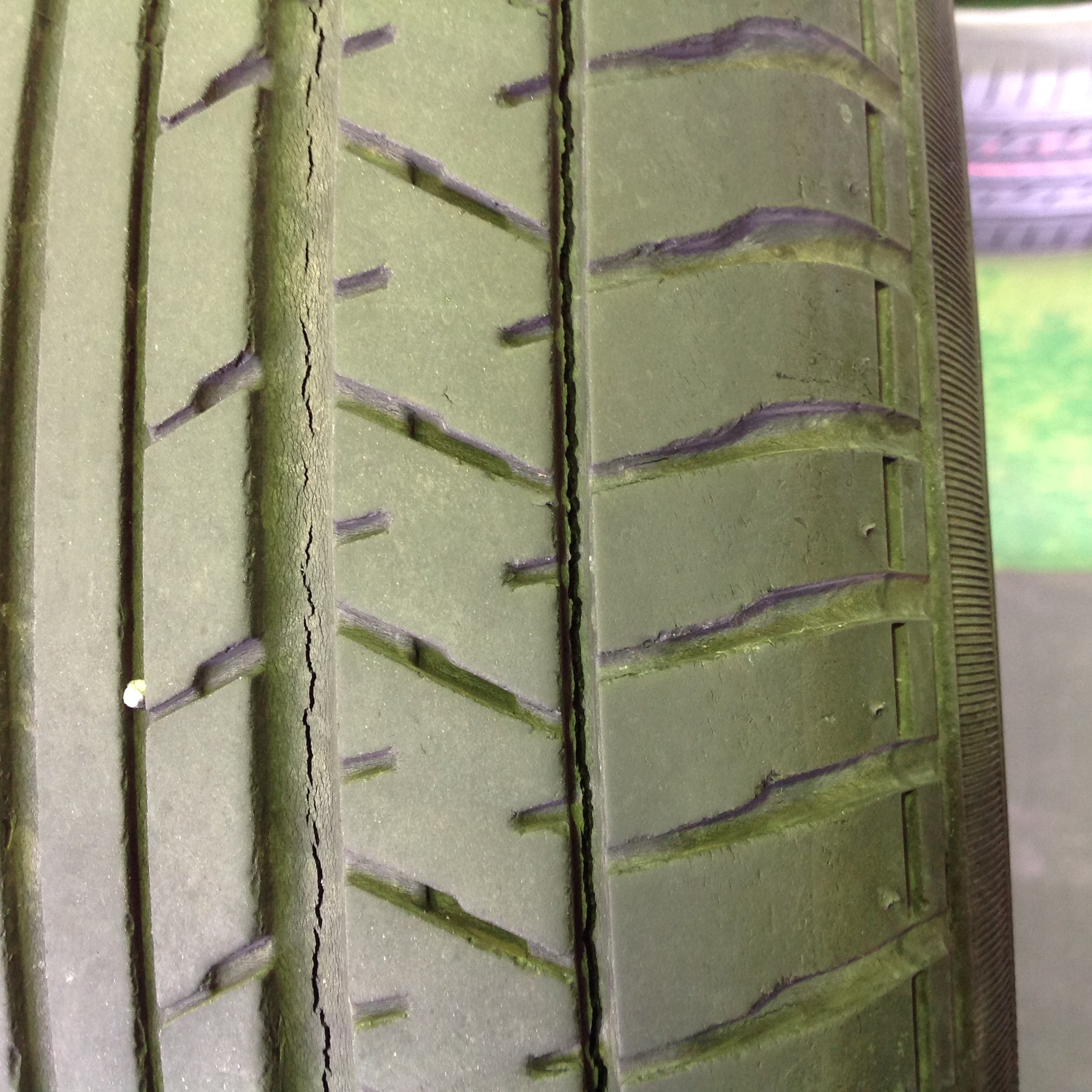 タイヤが薄くなっているミゾに、更にヒビが入っているので、そこからのパンク、バーストの恐れが高いのです。
