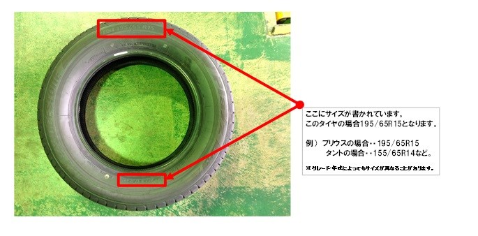 図が小さくて見づらいかもしれませんが、写真のタイヤの場合は195/65R15と書かれています。