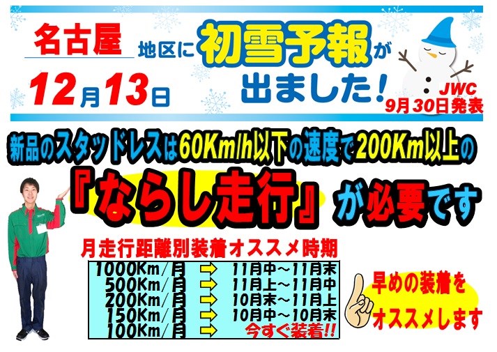 走行ペースに合わせて、早めのスタッドレスタイヤへの付け替えをオススメしております。