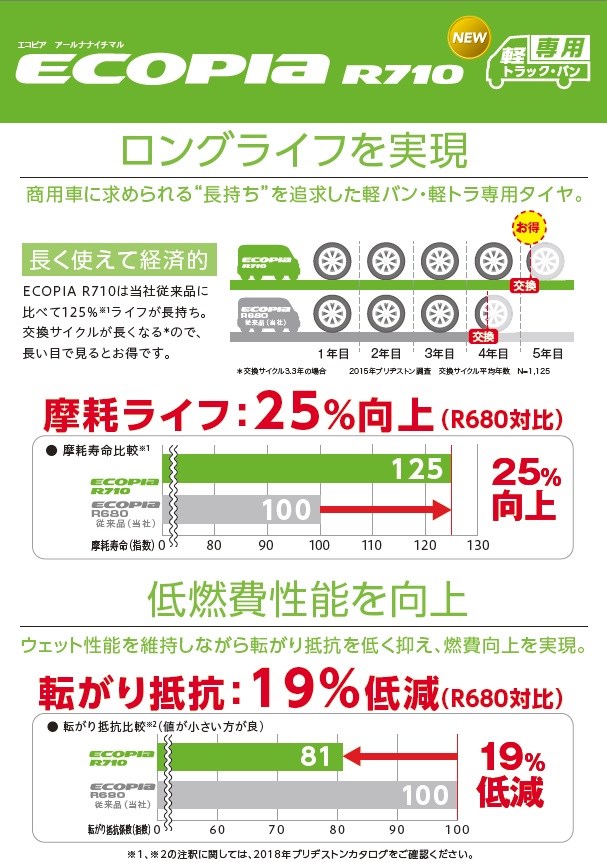 軽バンタイヤ【ECOPIA R710】 ポスト 【ECOPIA R710】 働く軽自動車専用設計だから、長持ちで低燃費を追求 従来品(ECOPIA R680)に比べてライフが長持ちしていますので交換サイクルが長くなります。 長い目で見るとお得です! 関連情報もあわせてご覧ください ECOPIA R710 カテゴリ:商品情報 タイヤ関連
