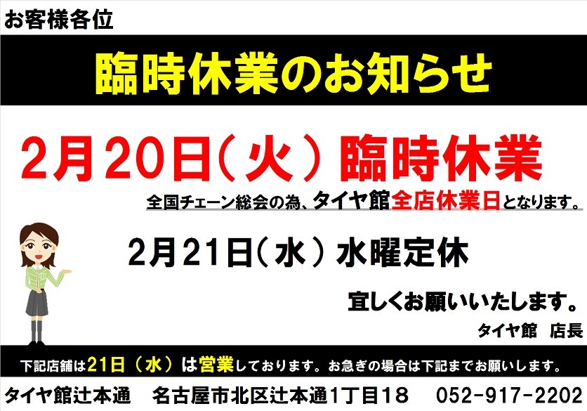 前にもご案内させて頂きましたが、明日2/20臨時休業となります。