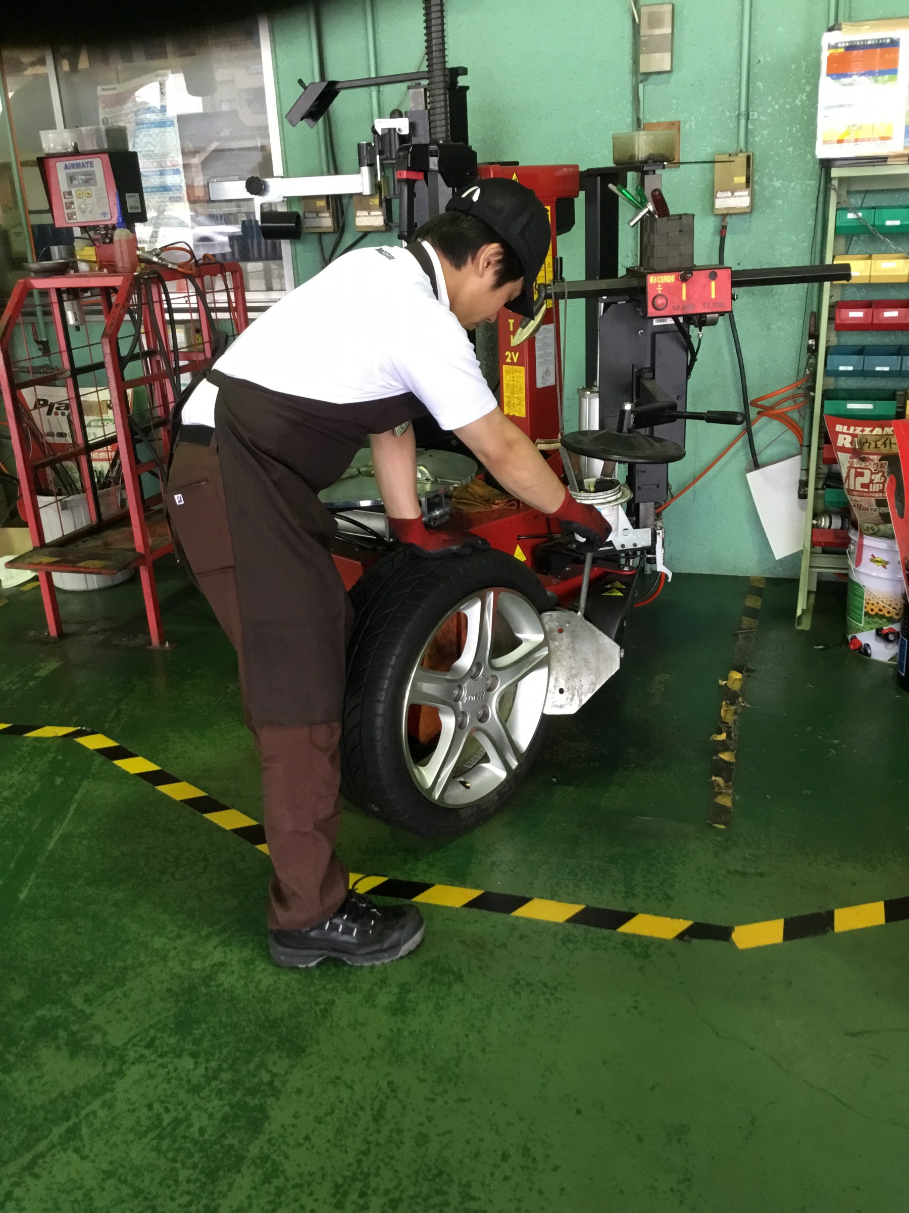この6月より新人スタッフ安江が加入しました。タイヤ交換の練習