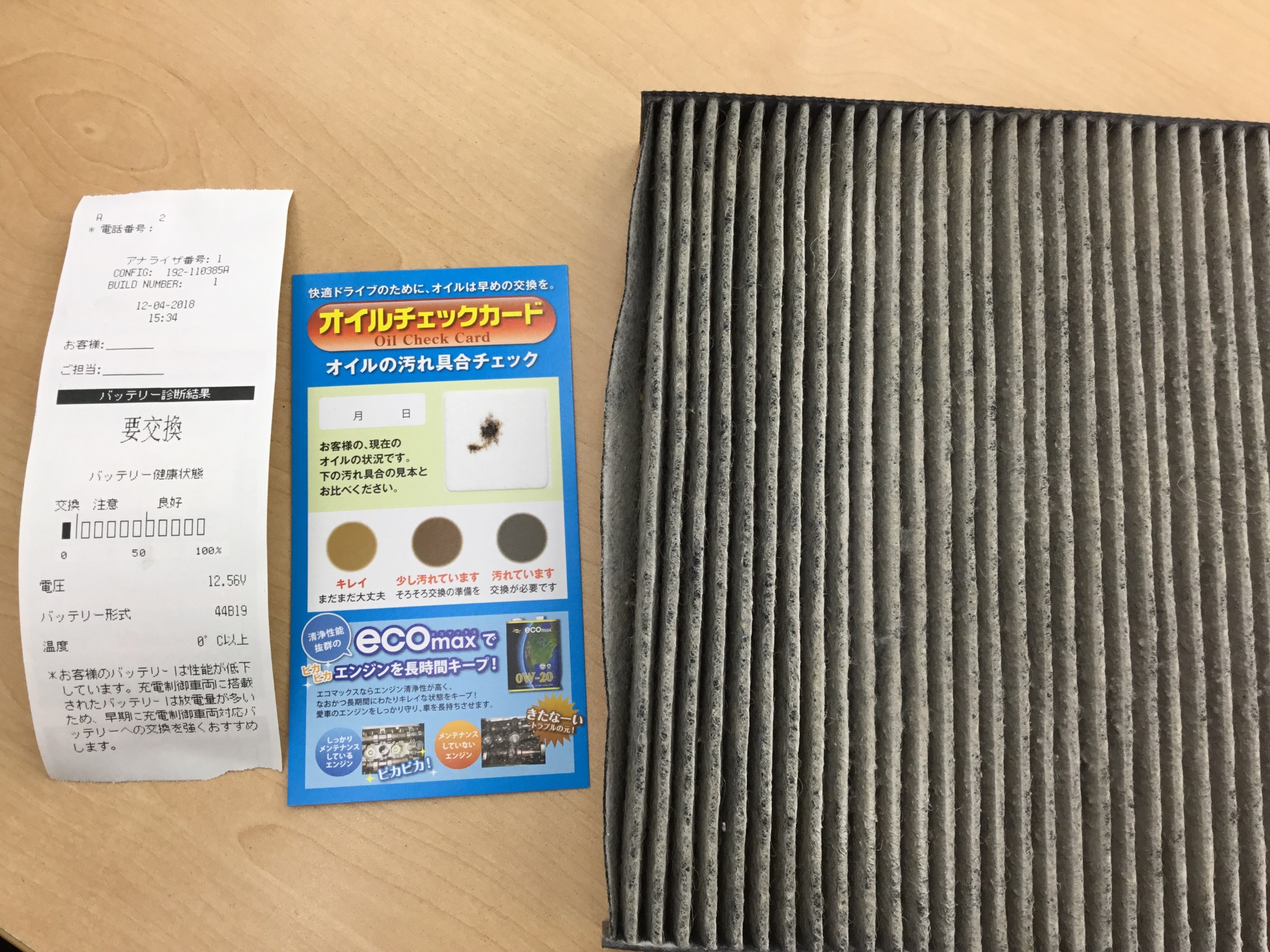 左から順番に、バッテリ-・エンジンオイル・エアコンフィルタ- 点検結果です。
