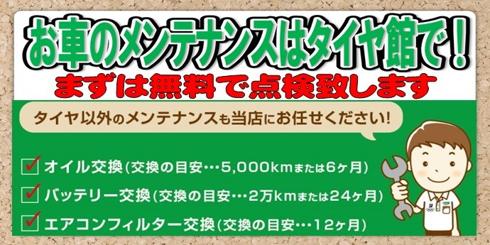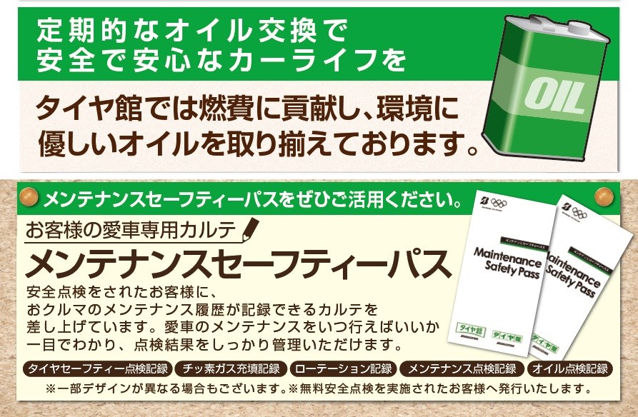 空気圧補充の何回かに1回はオイル交換が必要になってきますのでタイヤ館で空気圧点検(無料)のついでに一緒にオイル交換いかがですか?