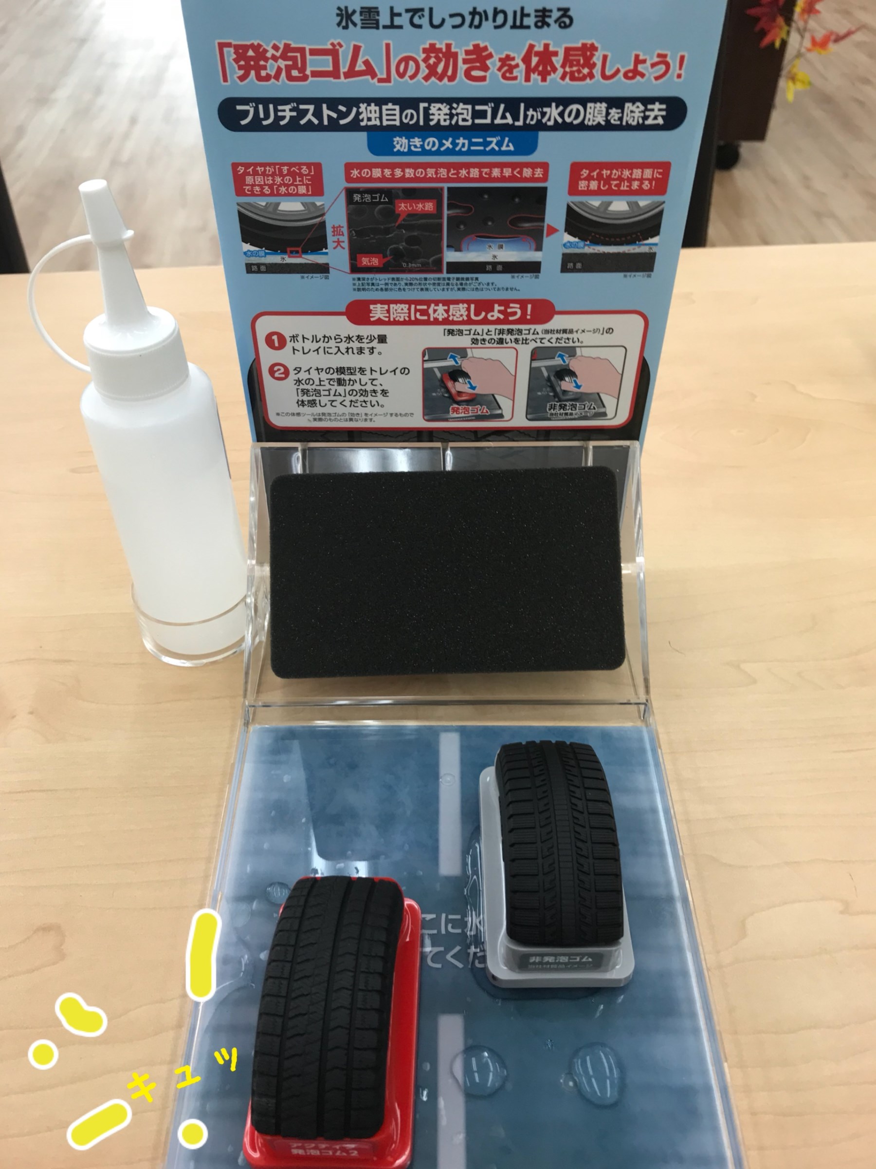 当店ではブリヂストンが誇るブリサックのスタッドレッスタイヤの発泡ゴムはどう違うかわかる体感ツ-ルがございます。